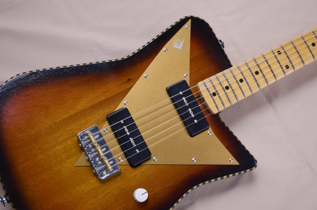 宇宙開発が進み未来的なデザインが好まれた1950年代のビザールギターを彷彿とさせていながら、しっかりとマテリアルにこだわり、斬新かつ現代の実用性を備えた1本。フリーハンドでデザインされたというボディは、まさに自由で奇抜なCGKオリジナルシェイプ。その第1号機です!
