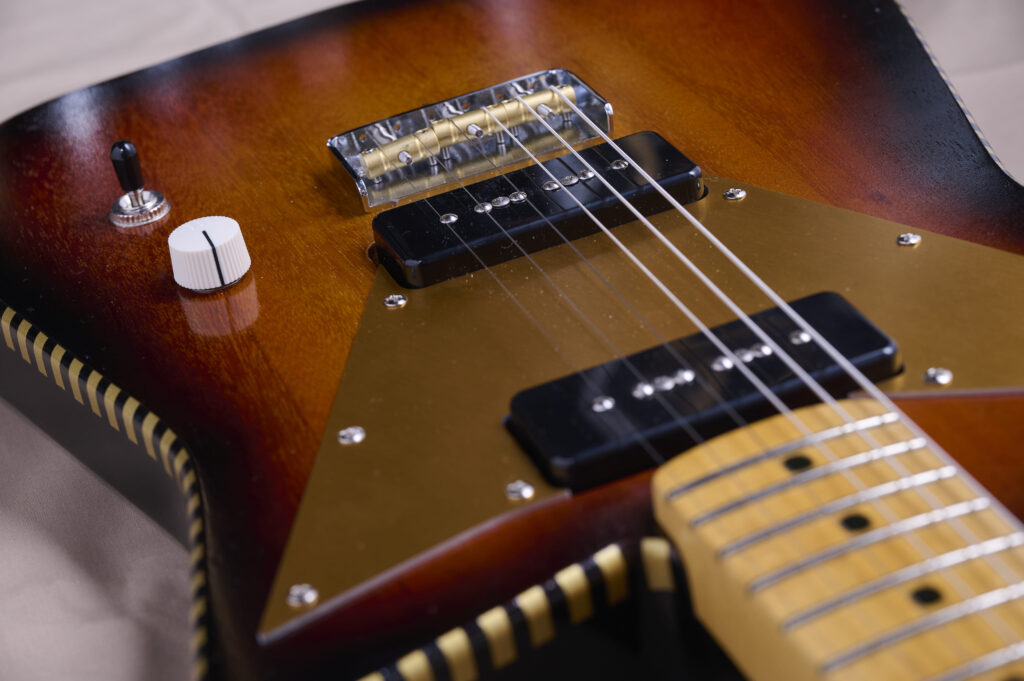 50年代のDesert Sandカラーにアノダイズドピックガード。レーザーで刻印したロゴの入ったVピックガードがキマってる!通常のM1と違うところはブリッジコマにTUSQ(人工象牙)サドルを使用した点。各弦の高さ調整が可能でフローティングしたダイナミックトレモロの適度な暴れ感を残しつつTUSQサドルによる豊かな倍音とサスティーンが得られるようにしました。