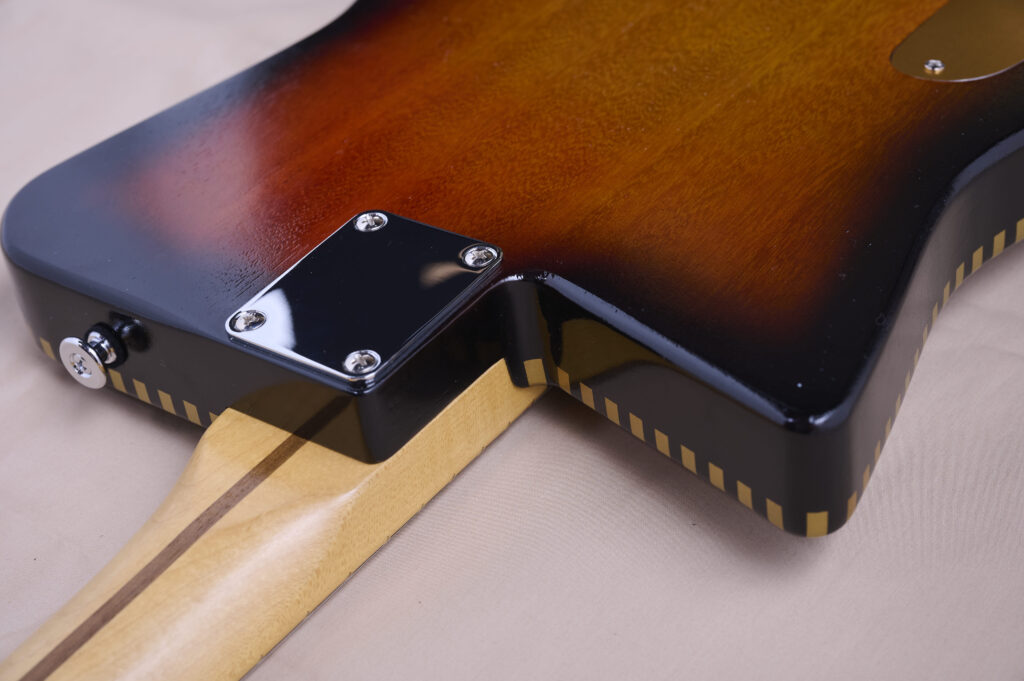 そして搭載したキャラメルズのオリジナル・アルニコVピックアップは大音量にした時にも耳に痛くないのがとても良いです。黄色味の強いDesert Sandカラーにゴールドのチェッカードステッチ、ゴールドのアノダイズドピックガードが何ともクラシカルで良い雰囲気を醸し出しています。