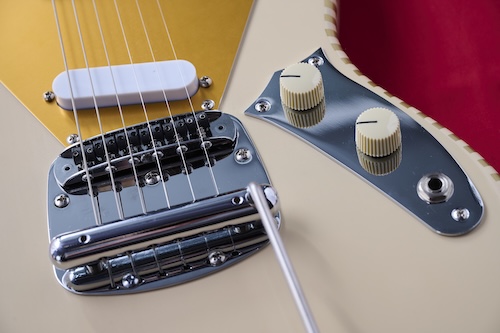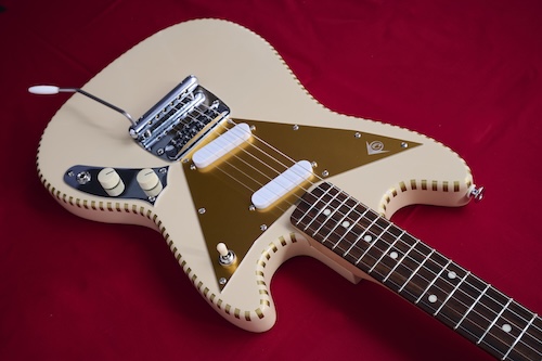50年代のDesert Sandカラーにアノダイズドピックガード。レーザーで刻印したロゴの入ったVピックガードがキマってる!通常のM1と違うところはブリッジコマにTUSQ(人工象牙)サドルを使用した点。各弦の高さ調整が可能でフローティングしたダイナミックトレモロの適度な暴れ感を残しつつTUSQサドルによる豊かな倍音とサスティーンが得られるようにしました。