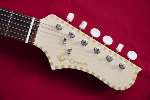 そして搭載したキャラメルズのオリジナル・アルニコVピックアップは大音量にした時にも耳に痛くないのがとても良いです。黄色味の強いDesert Sandカラーにゴールドのチェッカードステッチ、ゴールドのアノダイズドピックガードが何ともクラシカルで良い雰囲気を醸し出しています。