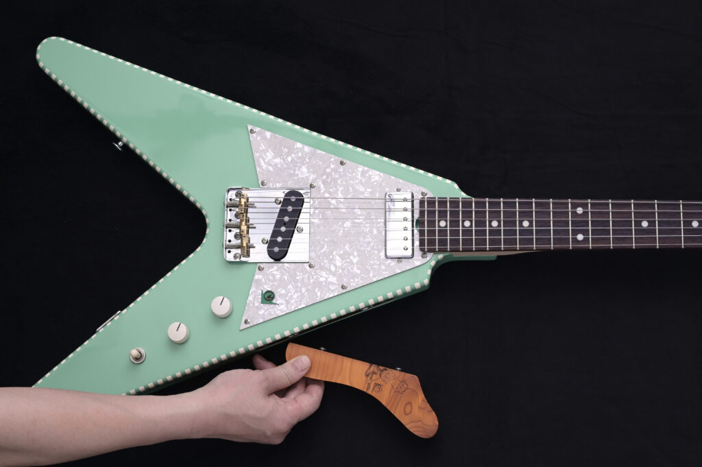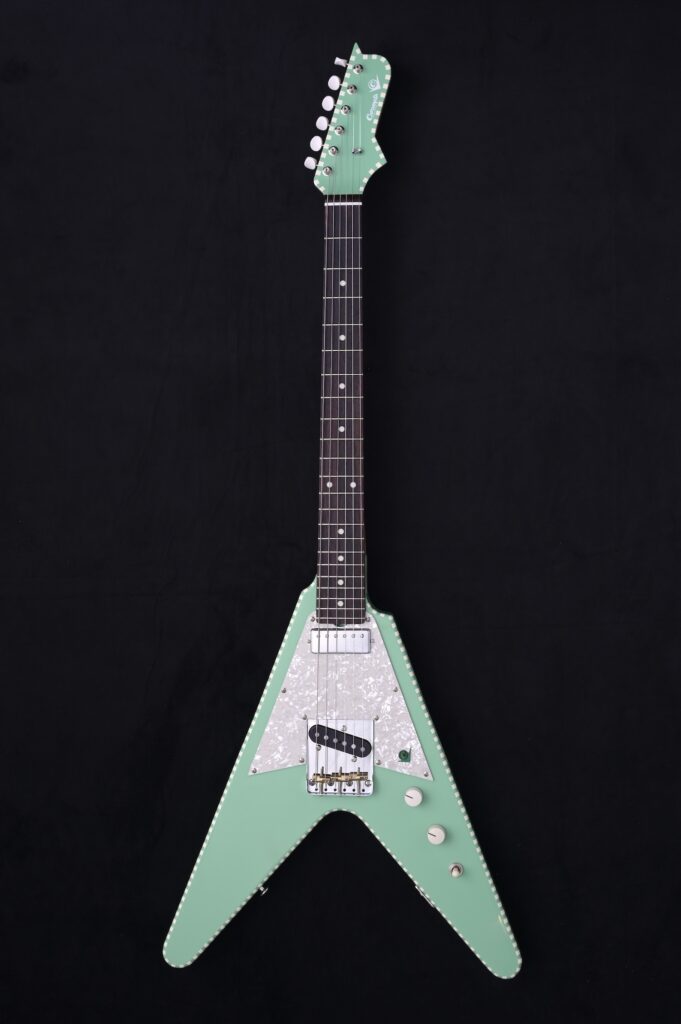加えて初のポリウレタン塗装、そして他のギターでは見受けられないオリジナルアタッチメント(座って弾く為のレッグレスト)を木製で製作。FV型といっても一筋縄ではいかず、随所にCGKらしい個性が散りばめられている。