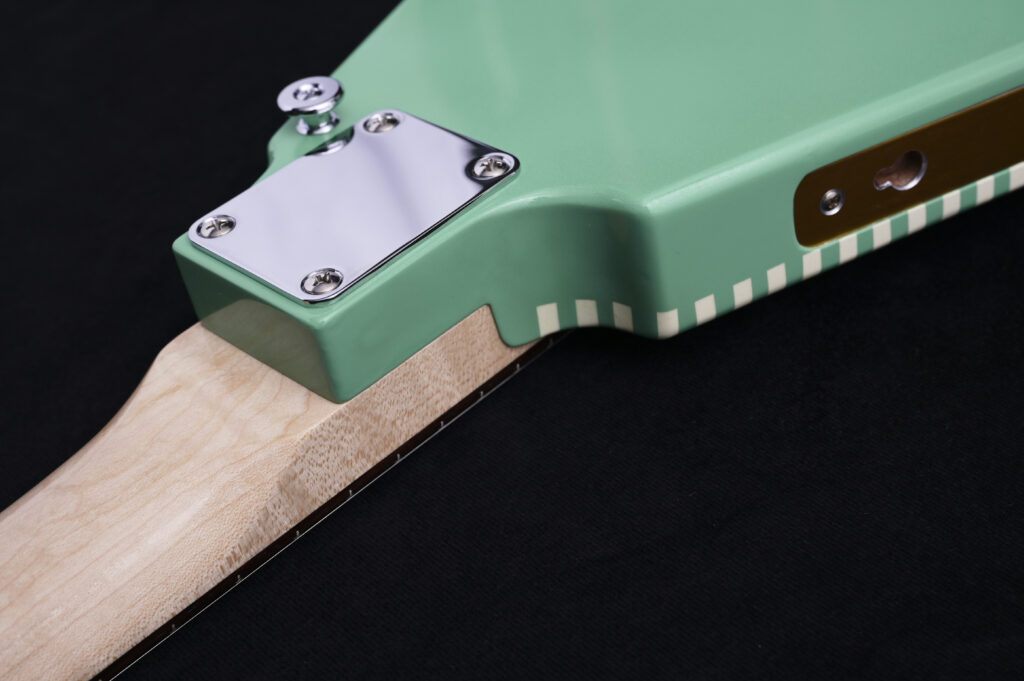 通常のFV型と大きく違うのは、ボルトオンのショートスケールのネック。そして40mm厚の薄型マホガニーボディで、CGKのV3シリーズと同じくフロントにRoswellのアルニコVシングルピックアップが搭載されている。マホガニーボディ材とRoswellの相性はV3で実証済みで、ミドル(中音域)の粒立ちと押し出しが明確。レスポンスもよく、クリーンも歪みも弾いていてとても気持ちがいいと数々のミュージシャン、カスタマーから好評を得ている。