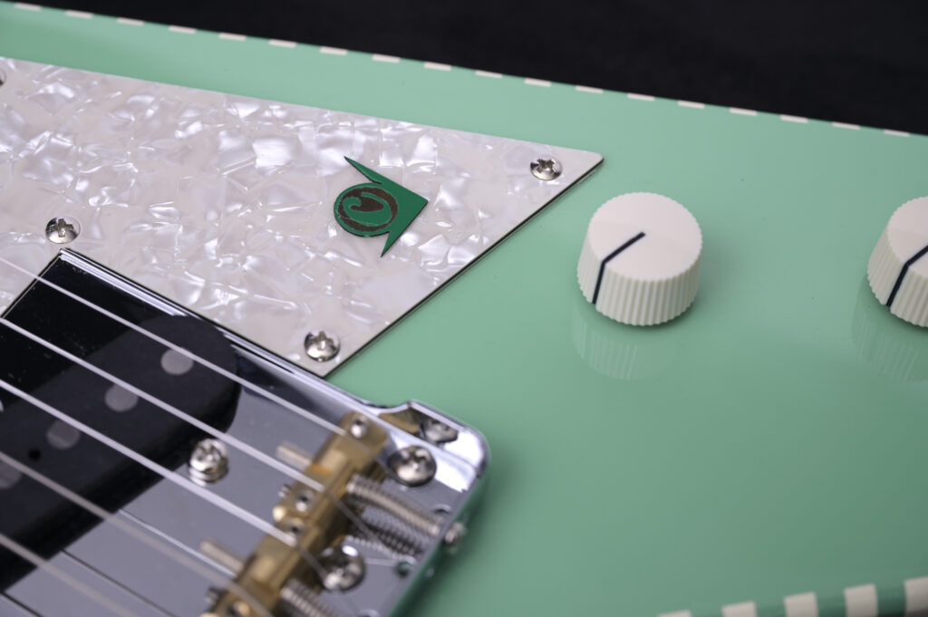 1月のプロトと同じミンドグリーンにエイジドシェルの小振りなピックガード。1ボリューム1トーンに3ウェイトグルスイッチと新たにトーンを加えました。