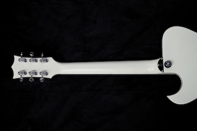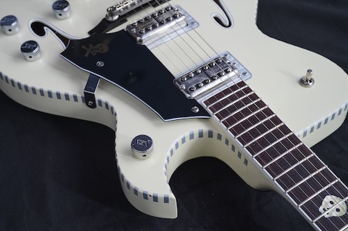 ボディのトップ、バック、サイドともにメイプル材プライウッドを使用。マホガニーとメイプル材を組み合わせた独自のセンターブロック構造の薄型ボディ。Fホールは上品になり過ぎない大胆なカーブで描き、オリジナルデザインのコウモリ風のピックガード。ピックアップセレクターを左肩に、右肩にマスターボリュームの追加。(フレットの端は落としていません)細部にわたってこだわりを散りばめた豪華な1本。