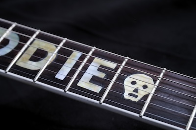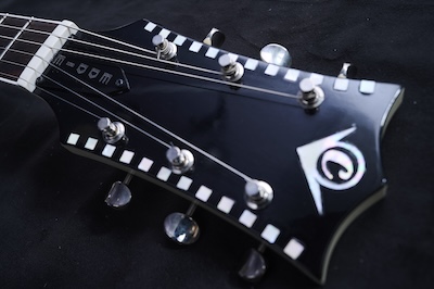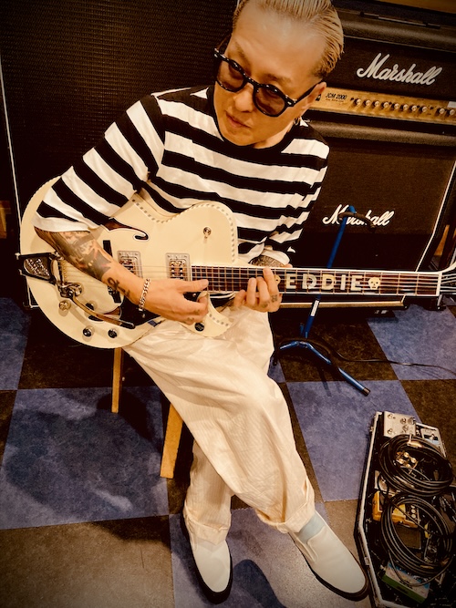 基本はCGKのセミアコS1_SicilyBlackと同型になるが、ピックアップはSeymour DuncanのPSYCLONE VINTAGE Filter’Tronが2つマウントされ、出力も高くパワフルで厚みのあるローが出ている。そのほかナットの溝幅やマスターボリュームの位置、アームの取手を360℃回転できるようにするなど細部にわたってEDDIE氏のこだわりが詰まっている。それに呼応するように本人のテイストを熟知した片田がピックガードやトラスロッドカバーなどオリジナルデザインを所々に散りばめていった。
